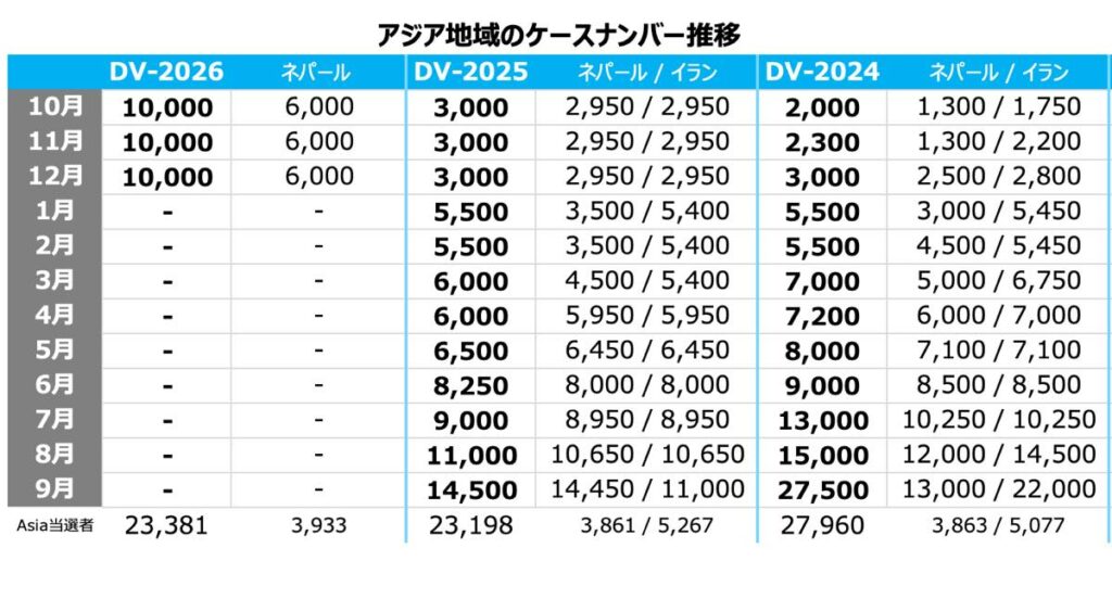 *ネパールは当選者数が多いため、アジア全体枠とは別にケースナンバーが定められています。DV2026の手続きから、イランは通常のアジア枠に含められました。