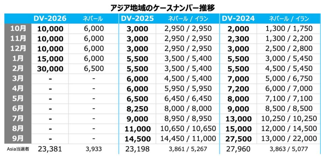 *ネパールは当選者数が多いため、アジア全体枠とは別にケースナンバーが定められています。DV2026の手続きから、イランは通常のアジア枠に含められました。