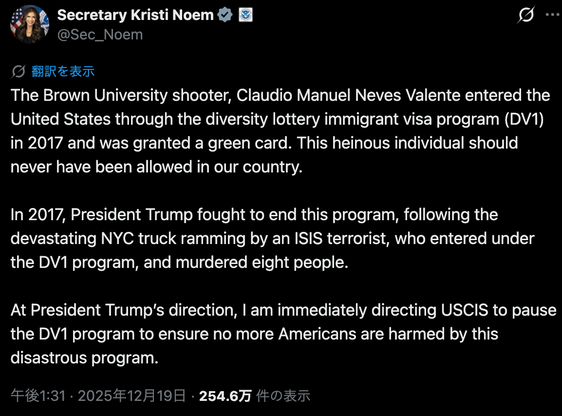 アメリカ時間の本日2025年12月19日、米国現政権から以下のようなアナウンスメントがありました。