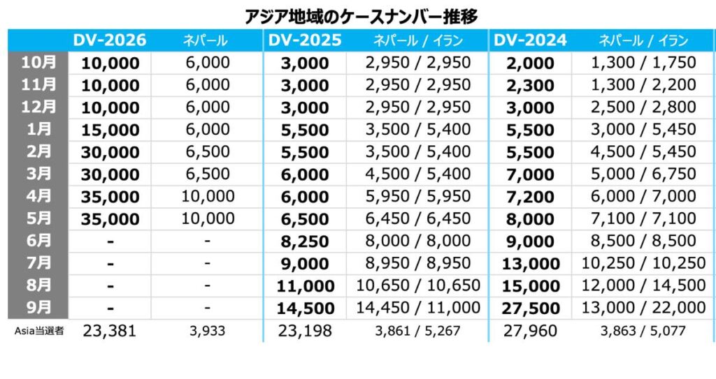 *ネパールは当選者数が多いため、アジア全体枠とは別にケースナンバーが定められています。DV2026の手続きから、イランは通常のアジア枠に含められました。