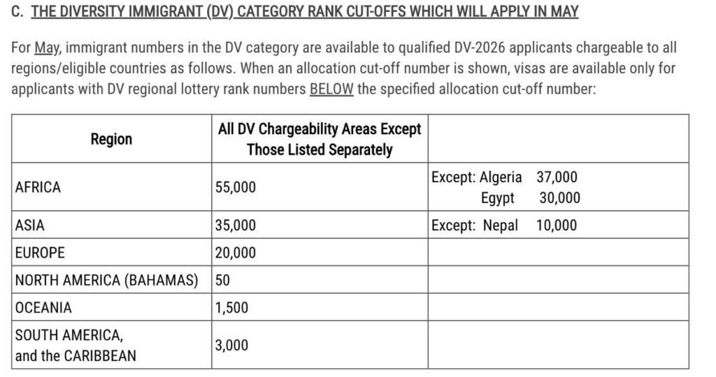DV2026アメリカ抽選永住権(グリーンカード抽選)の面接は、上の表のように、米国務省から毎月発表されるケースナンバーにもとづいて進められていきます。 “Visa Bulletin”で検索してください。URLは変更になることがありますが、US Department of Stateから毎月発表になりますので、かならず公式サイトからもご確認ください。毎月10日前後ですが、場合により15日ごろになる場合もあります。